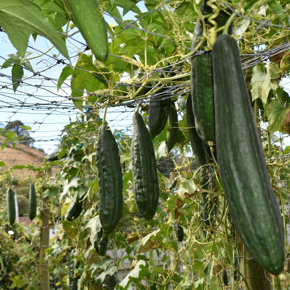 The large marrow looking fruit is very heavy so we use a solid structure to hold them up and make sure they grow nice and straight for our customers. The vines take up a lot of space and at peak growing time you can see the daily growth in the vine, this also means a lot of tying to ensure the tendrils can latch onto the structure. At the end of the season the plant starts to take all the nutrients and moisture back out of the heavy loofah and they start to dry off. When they become light and the skins begin to brown we harvest them. Harvesting can take up to two to three months depending on the autumn season.